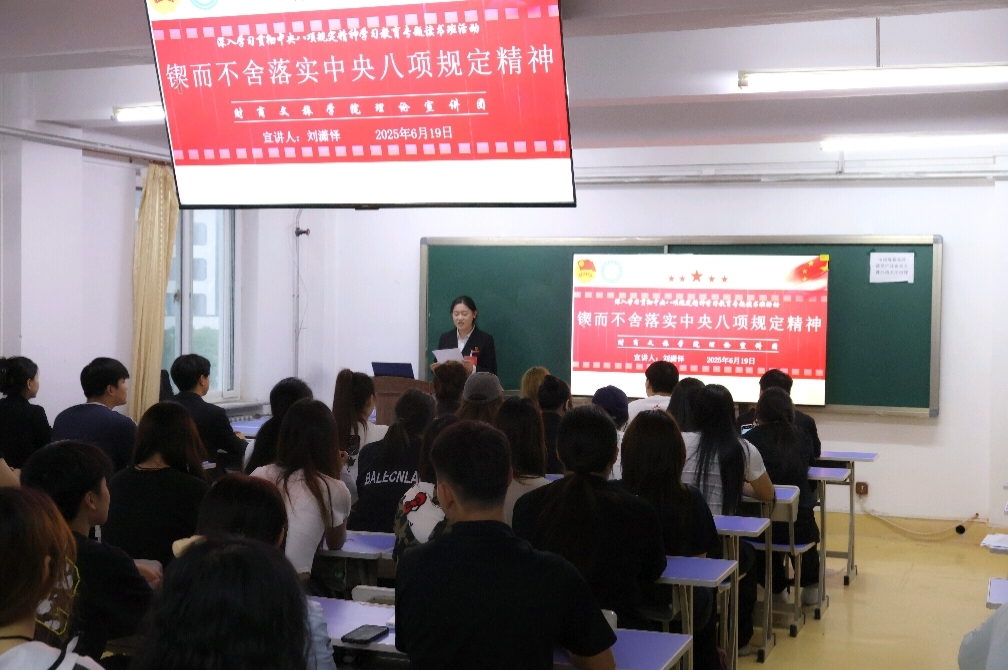 我院理论宣讲团在成立深入贯彻中央八项规定精神学习教育专题读书班后,为持续深化学习成效,宣讲团于6月19日在开发区校区429教室开展深入贯彻中央八项规定精神学习教育读书活动。各班班长、团支书及全体宣讲团成员共同参与。宣讲团成员刘潇怿担任主讲人。