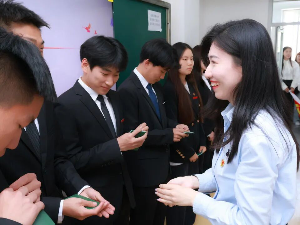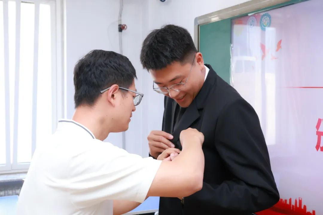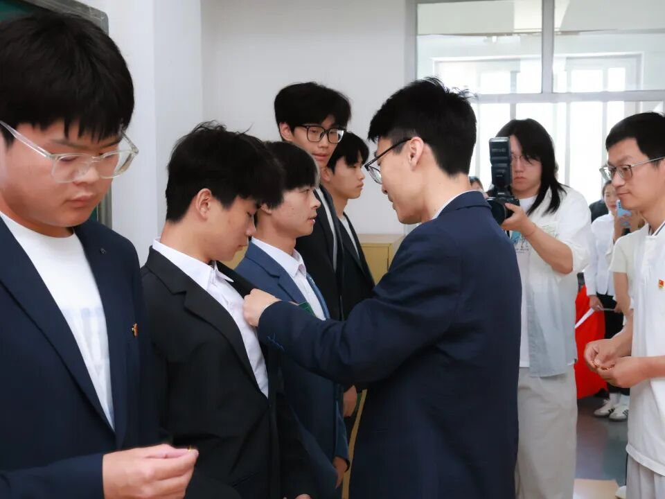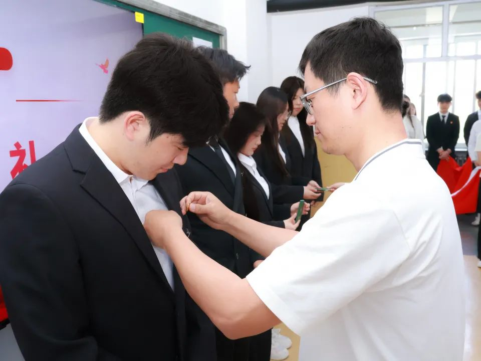 入团仪式在激昂的国歌声中正式开启,点燃青春报国之志。我院团总支干事聂文琼老师宣读新发展团员名单,继而进行颁发礼,各位老师满怀祝福与期望,亲手为新发展团员颁发团员证并佩戴团徽。闪光的团徽如同星辰,缀在新团员胸前,既闪耀着团员身份的荣光,也沉甸甸地承载着共青团的使命。